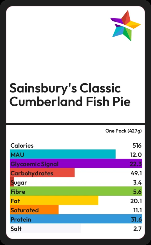 Sainsbury's Classic Cumberland Fish Pie contains 516.7 calories in one Pack (427g).