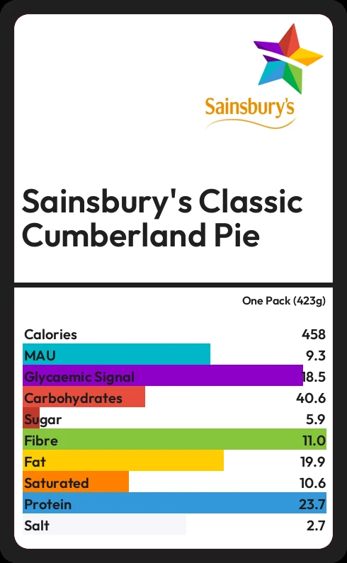 Sainsbury's Classic Cumberland Pie contains 456.8 calories in one Pack (423g).