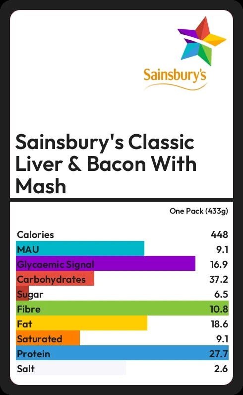 Sainsbury's Classic Liver & Bacon With Mash contains 446 calories in one Pack (433g).
