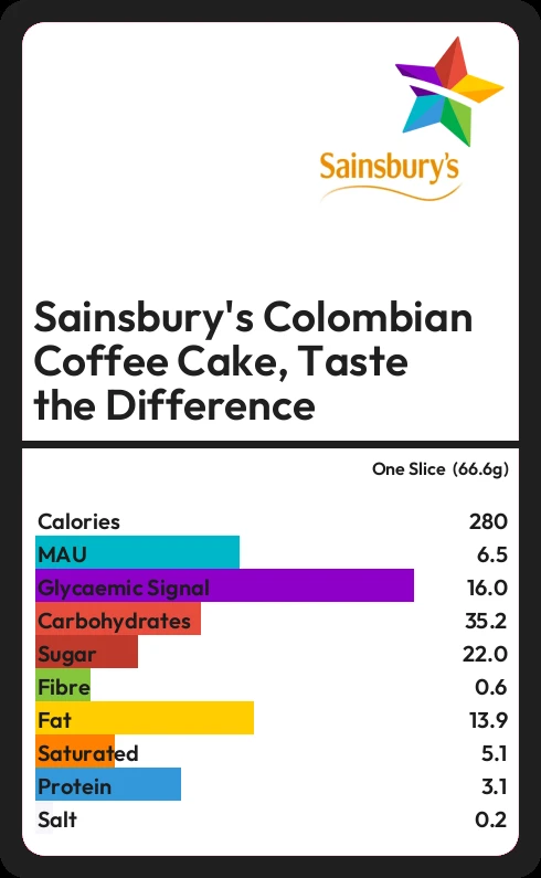 Sainsbury's Colombian Coffee Cake, Taste the Difference contains 22.0g sugar in one Slice (66.6g) - that is around 6 cubes of sugar.