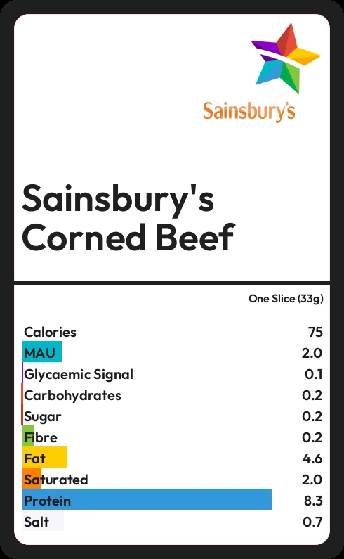 Sainsbury's Corned Beef contains 0.2g sugar in one Slice (33g)