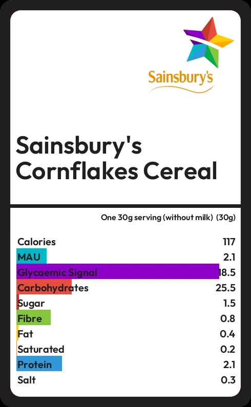 Sainsbury's Cornflakes Cereal contains 116.7 calories in one 30g serving (without milk)  (30g).