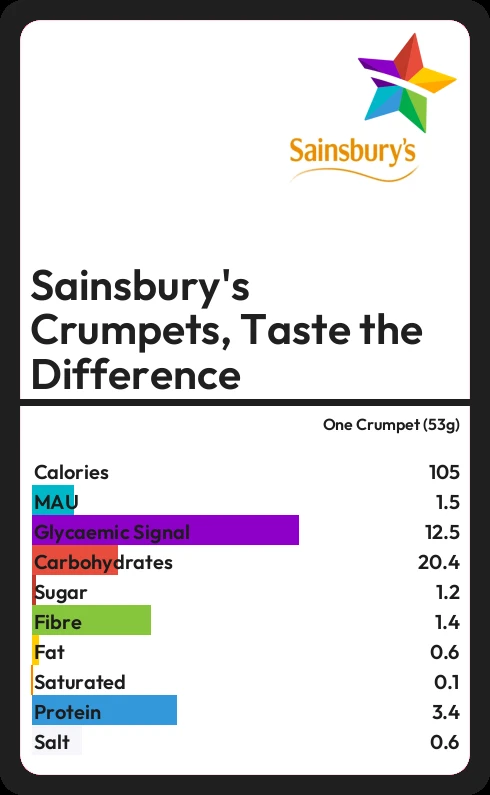 Sainsbury's Crumpets, Taste the Difference contains 1.2g sugar in one Crumpet (53g)