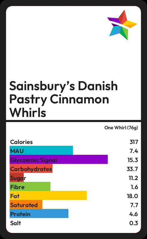 Sainsbury’s Danish Pastry Cinnamon Whirls contains 11.2g sugar in one Whirl (76g) - that is around 3 cubes of sugar.