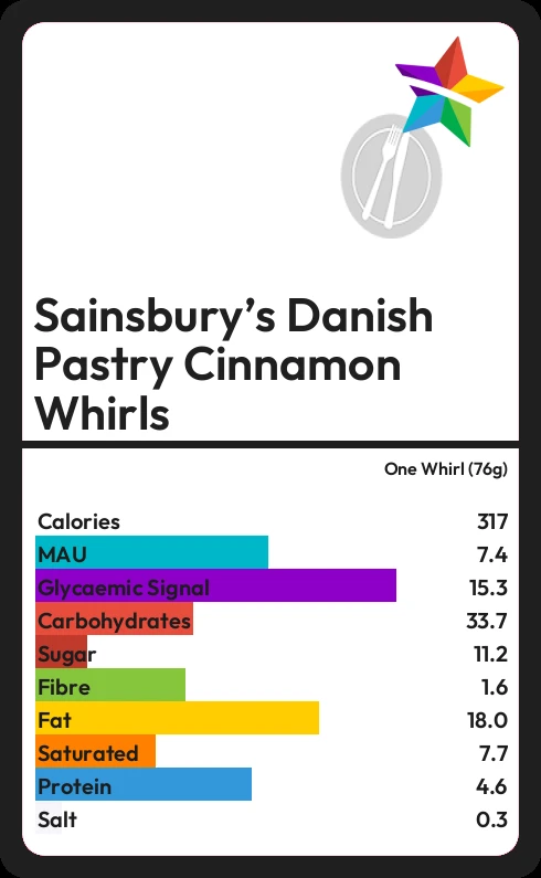 Sainsbury’s Danish Pastry Cinnamon Whirls contains 11.2g sugar in one Whirl (76g) - that is around 3 cubes of sugar.