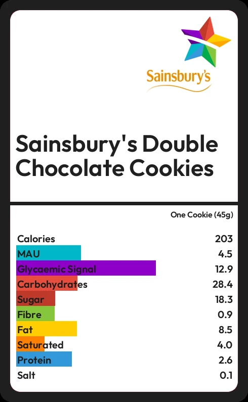 Sainsbury's Double Chocolate Cookies contains 18.3g sugar in one Cookie (45g) - that is around 5 cubes of sugar.