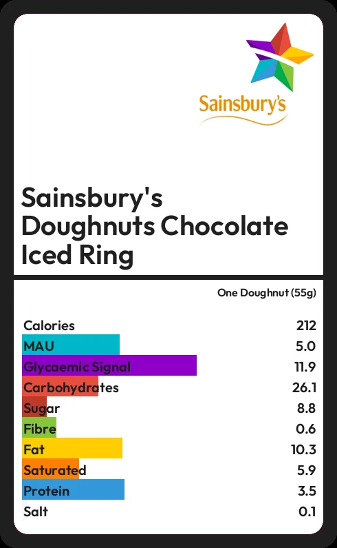 Sainsbury's Doughnuts Chocolate Iced Ring contains 8.8g sugar in one Doughnut (55g) - that is around 2 cubes of sugar.