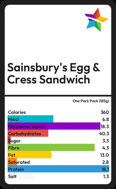 Sainsbury's Egg & Cress Sandwich contains 360.8 calories in one Pack Pack (185g).