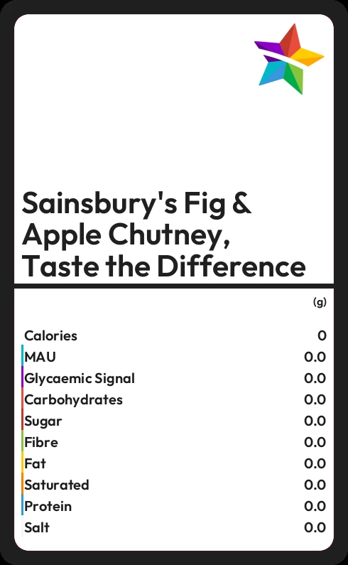 In 100g of Sainsbury's Fig & Apple Chutney, Taste the Difference there are 0.6g of fat of which 0.4g are saturated.