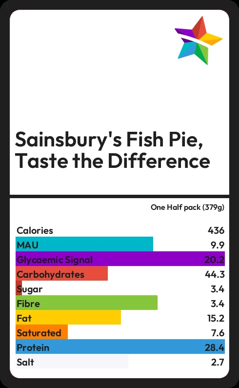 In one Half pack (379g) of Sainsbury's Fish Pie, Taste the Difference there are 15.2g of fat of which 7.6g are saturated.