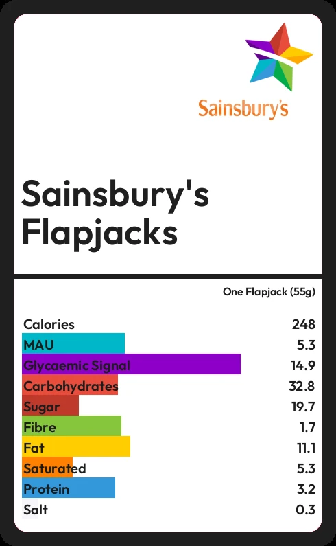 Sainsbury's Flapjacks contains 19.7g sugar in one Flapjack (55g) - that is around 5 cubes of sugar.
