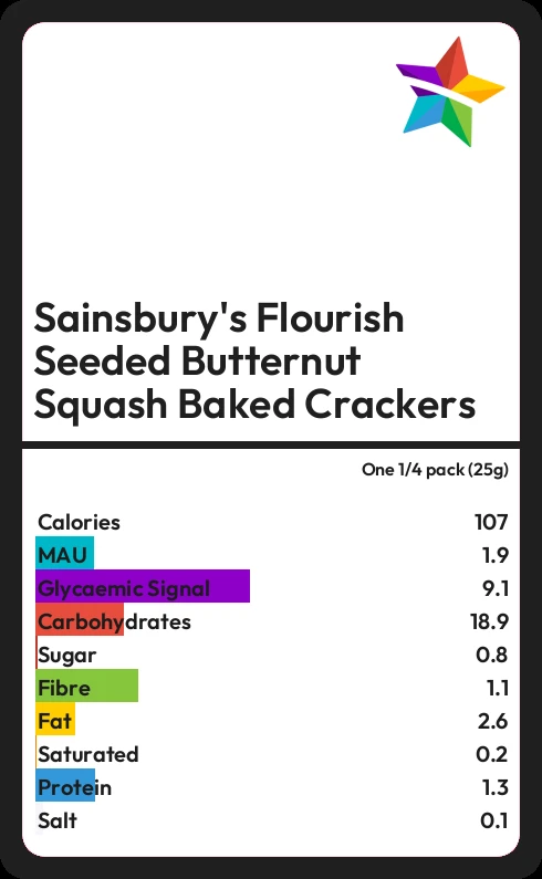 Sainsbury's Flourish Seeded Butternut Squash Baked Crackers contains 106.8 calories in one 1/4 pack (25g).