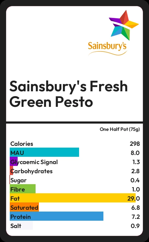 Sainsbury's Fresh Green Pesto contains 298.5 calories in one Half Pot (75g).