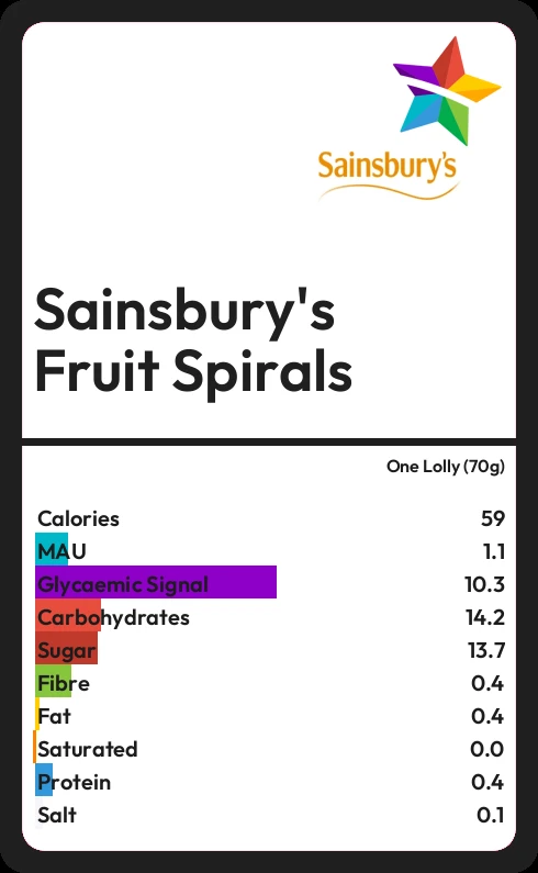 Sainsbury's Fruit Spirals contains 58.8 calories in one Lolly (70g).