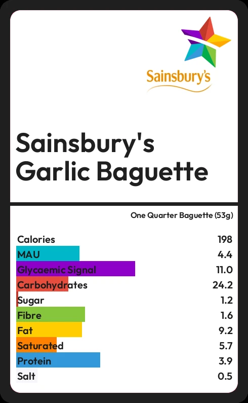 Sainsbury's Garlic Baguette contains 1.2g sugar in one Quarter Baguette (53g)