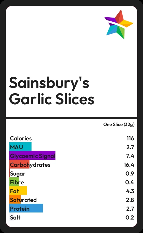 Sainsbury's Garlic Slices contains 0.9g sugar in one Slice (32g)