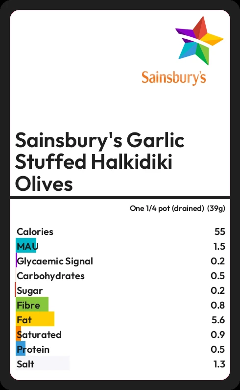 How much fat in Sainsbury's Garlic Stuffed Halkidiki Olives?