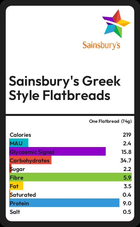 Sainsbury's Greek Style Flatbreads contains 219.8 calories in one Flatbread (74g).