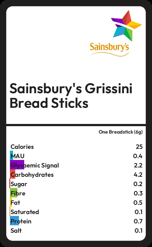 Sainsbury's Grissini Bread Sticks contains 24.7 calories in one Breadstick (6g).