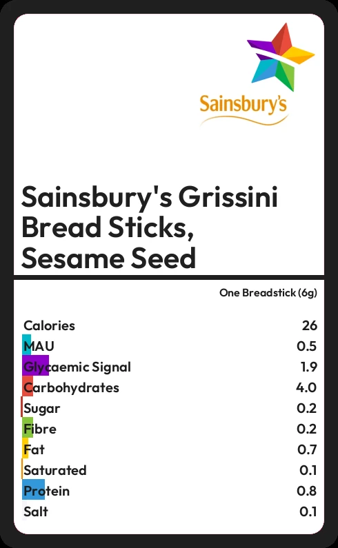 Sainsbury's Grissini Bread Sticks, Sesame Seed contains 25.6 calories in one Breadstick (6g).