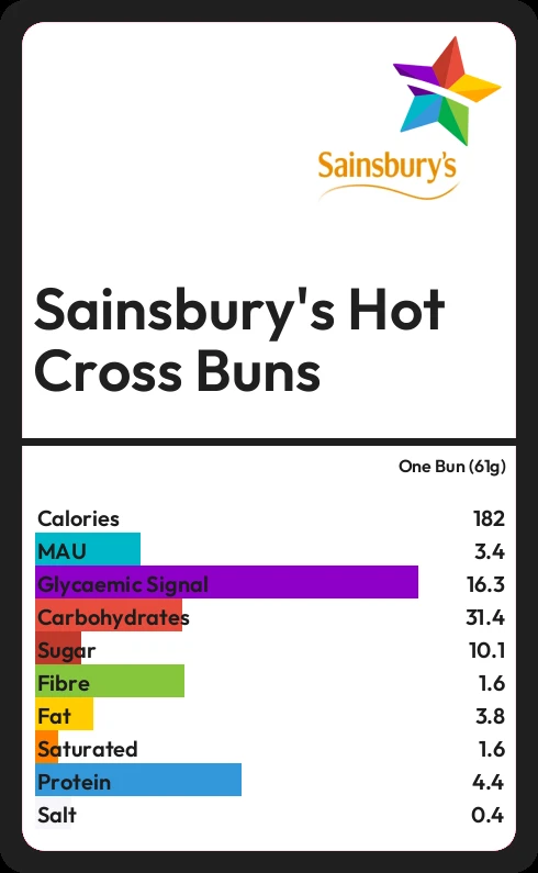 Sainsbury's Hot Cross Buns contains 10.1g sugar in one Bun (61g) - that is around 3 cubes of sugar.