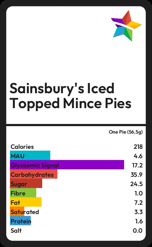 Sainsbury's Iced Topped Mince Pies contains 218.1 calories in one Pie (56.5g).