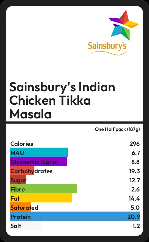 Sainsbury's Indian Chicken Tikka Masala contains 295.5 calories in one Half pack (187g).