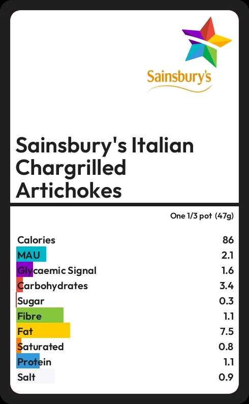 Sainsbury's Italian Chargrilled Artichokes contains 86.5 calories in one 1/3 pot  (47g).