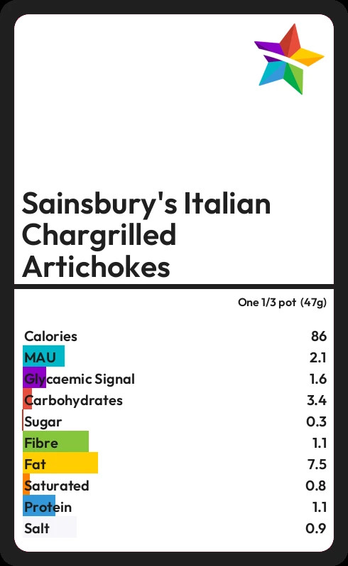 Sainsbury's Italian Chargrilled Artichokes contains 86.5 calories in one 1/3 pot  (47g).