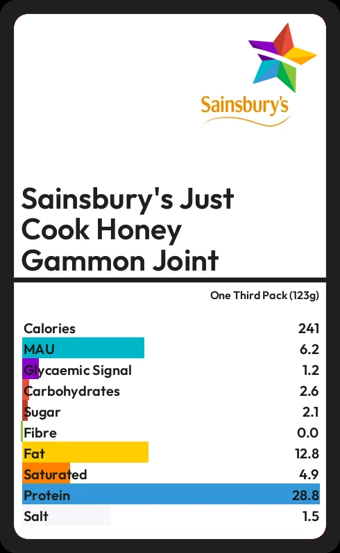 Sainsbury's Just Cook Honey Gammon Joint contains 241.1 calories in one Third Pack (123g).