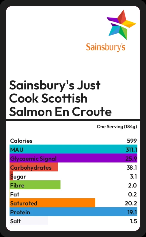Sainsbury's Just Cook Scottish Salmon En Croute contains 3.1g sugar in one Serving (184g) - that is around 1 cube of sugar.
