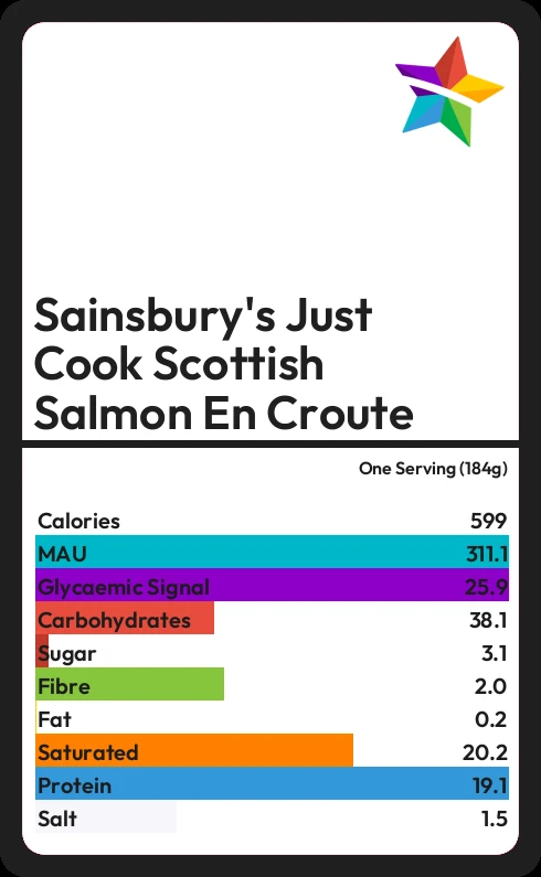 Sainsbury's Just Cook Scottish Salmon En Croute contains 599.8 calories in one Serving (184g).