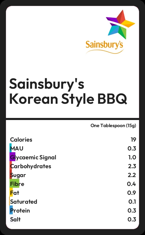 Sainsbury's Korean Style BBQ contains 18.8 calories in one Tablespoon (15g).