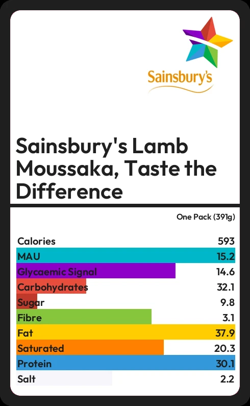 In one Pack (391g) of Sainsbury's Lamb Moussaka, Taste the Difference there are 37.9g of fat of which 20.3g are saturated.