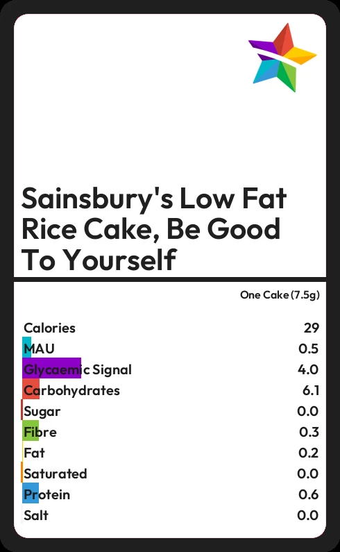 Sainsbury's Low Fat Rice Cake, Be Good To Yourself contains 29.4 calories in one Cake (7.5g).