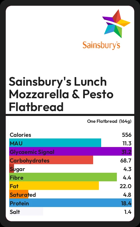 Sainsbury's Lunch Mozzarella & Pesto Flatbread contains 556 calories in one Flatbread  (164g).