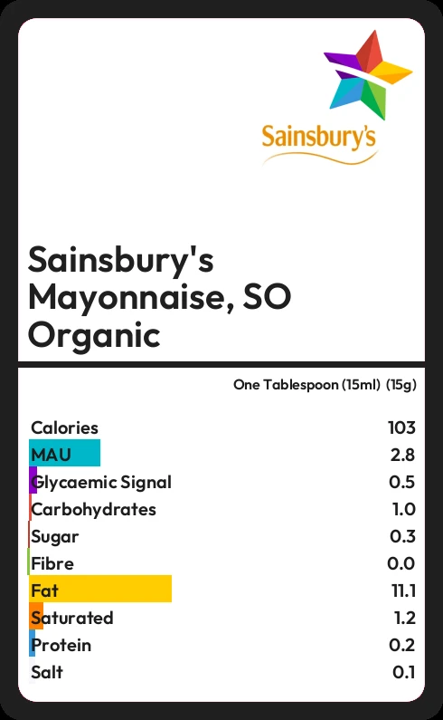 Sainsbury's Mayonnaise, SO Organic contains 0.3g sugar in one Tablespoon (15ml)  (15g)