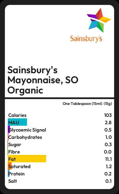 Sainsbury's Mayonnaise, SO Organic contains 102.6 calories in one Tablespoon (15ml)  (15g).