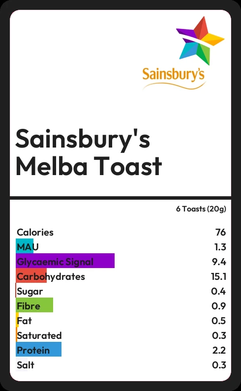Sainsbury's Melba Toast contains 0.4g sugar in 6 Toasts (20g)