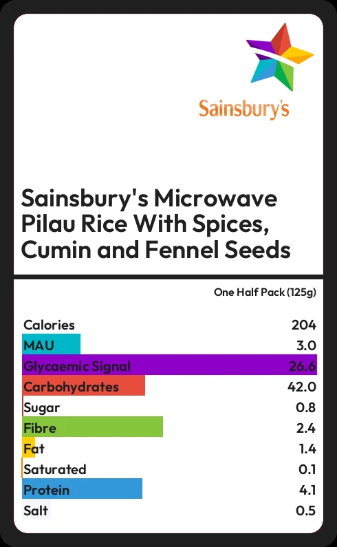 Sainsbury's Microwave Pilau Rice With Spices, Cumin and Fennel Seeds contains 0.8g sugar in one Half Pack (125g)