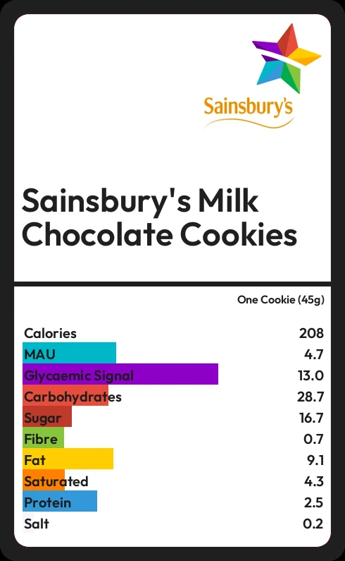 Sainsbury's Milk Chocolate Cookies contains 208.4 calories in one Cookie (45g).