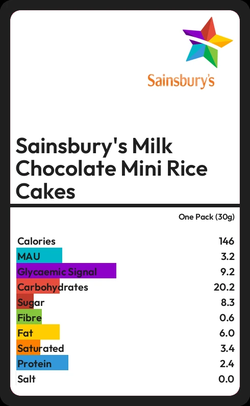 Sainsbury's Milk Chocolate Mini Rice Cakes contains 145.5 calories in one Pack (30g).