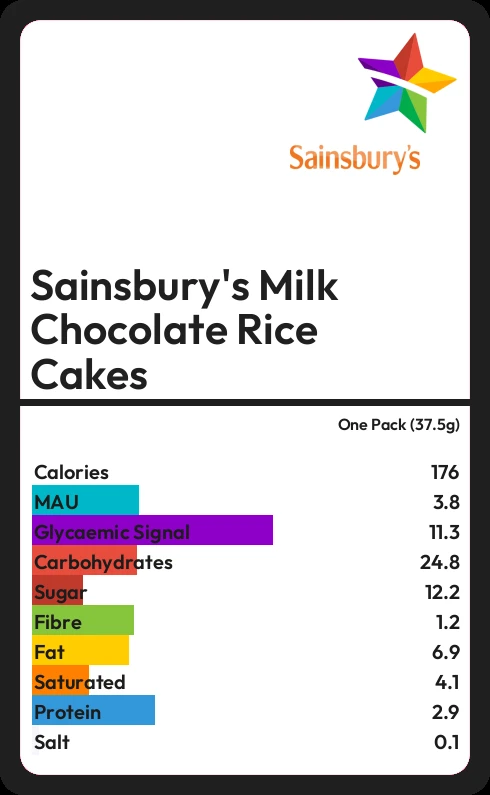Sainsbury's Milk Chocolate Rice Cakes contains 12.2g sugar in one Pack (37.5g) - that is around 3 cubes of sugar.
