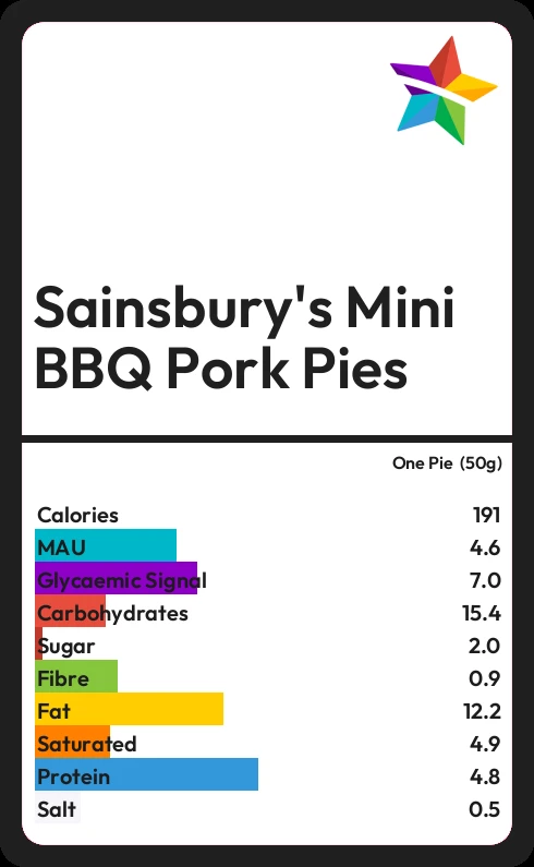 Sainsbury's Mini BBQ Pork Pies contains 191 calories in one Pie (50g).