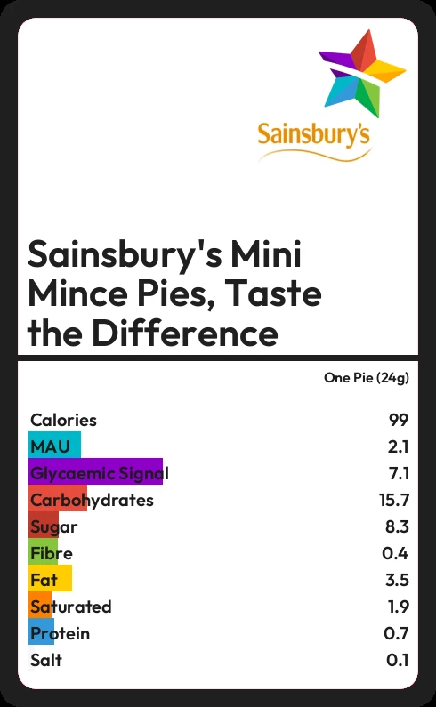 Sainsbury's Mini Mince Pies, Taste the Difference contains 98.9 calories in one Pie (24g).