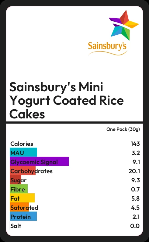 Sainsbury's Mini Yogurt Coated Rice Cakes contains 9.3g sugar in one Pack (30g) - that is around 2 cubes of sugar.