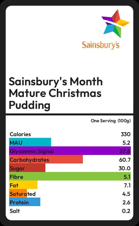 Sainsbury's Month Mature Christmas Pudding contains 30.0g sugar in one Serving (100g) - that is around 8 cubes of sugar.