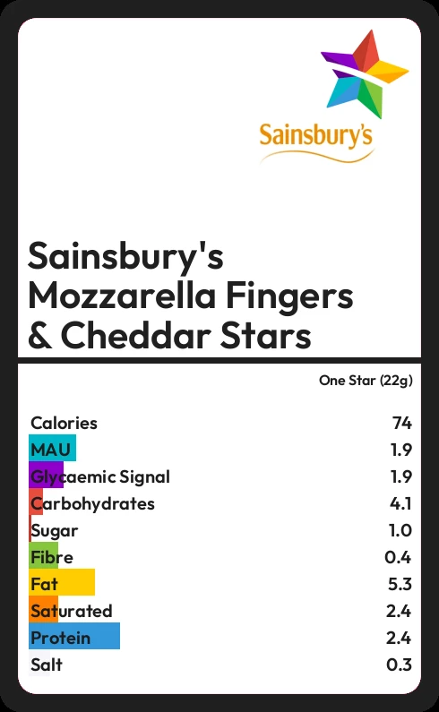 Sainsbury's Mozzarella Fingers & Cheddar Stars contains 1.0g sugar in one Star (22g)
