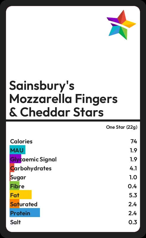 Sainsbury's Mozzarella Fingers & Cheddar Stars contains 1.0g sugar in one Star (22g)