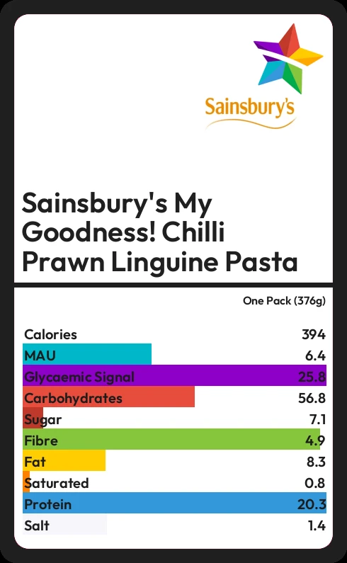 Sainsbury's My Goodness! Chilli Prawn Linguine Pasta contains 394.8 calories in one Pack (376g).